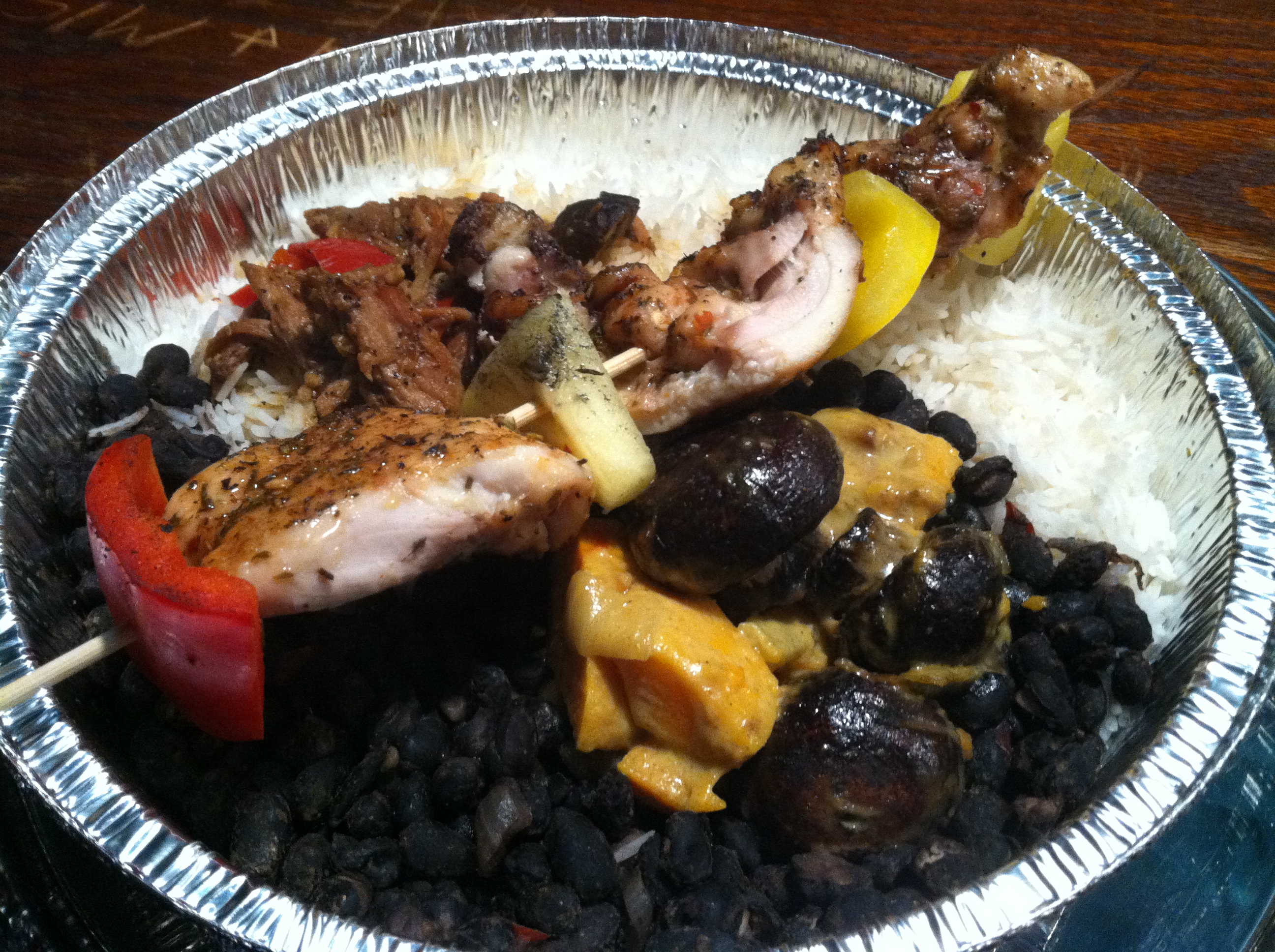 I enjoyed all signs of the cross of Caribbean cuisines in the trinity pan, and though they could be improved, I did not find these creations blasphemous to their islands of inspiration. This pan dish included a large serving of seasoned black beans and long-grain white rice, which sopped up the juices and added bulk to the entrée. A substitution for peas was also available.