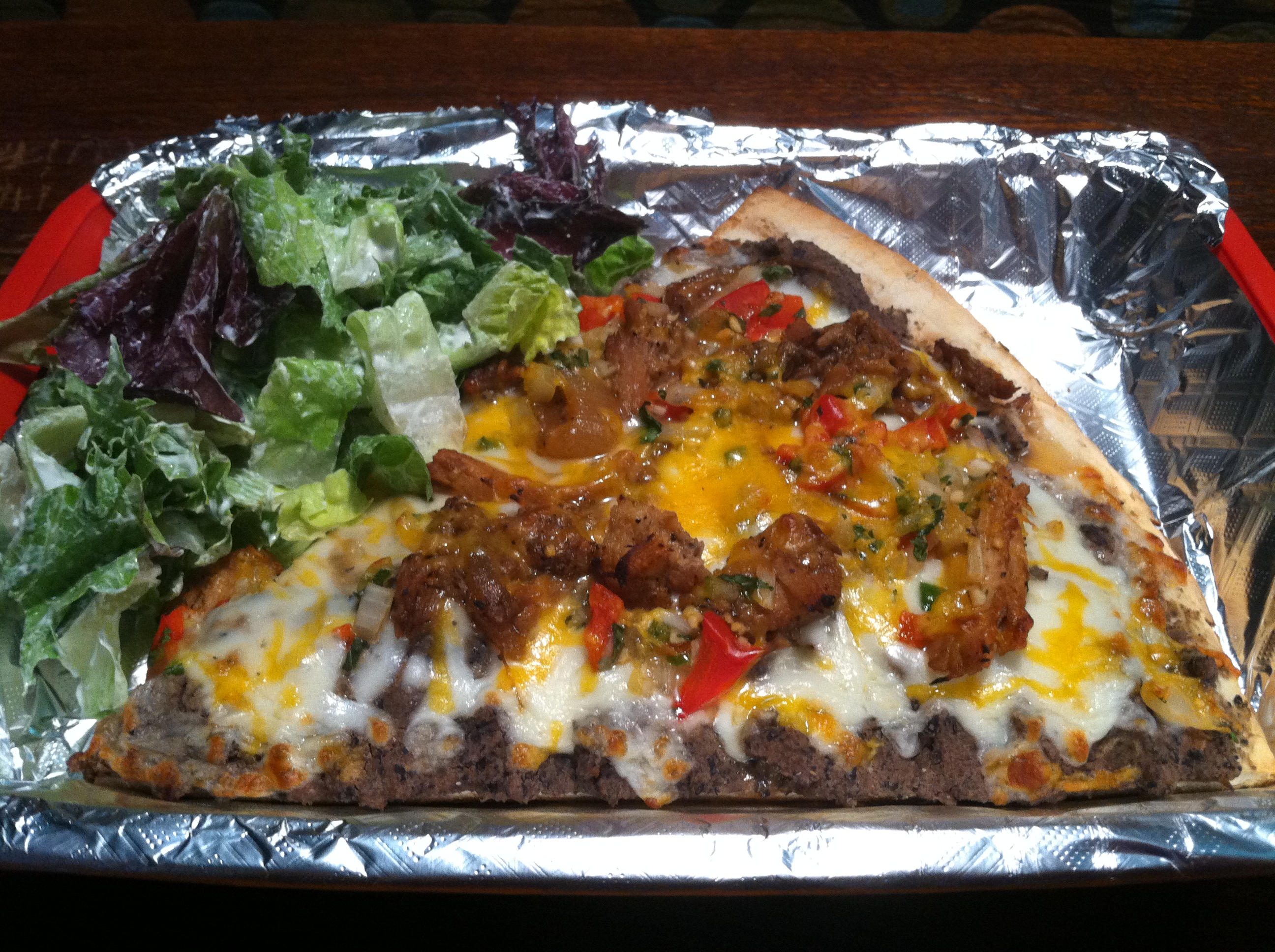 Next, I sampled a wedge of the mojo flat ($4), which was basically like a slice of pizza with a refried black bean base. It was topped with the same mojo pork from the pan dish, and these juicy, tender pork chunks were smothered in melted white and yellow cheddar cheeses, with pico de gallo and cilantro as an appetizing entourage. A mixed lettuce and sour cream salad was served to the side, either to eat on its own or to plop on top of the pie. While I enjoyed the melding of flavors with the toppings, I wasn’t crazy about the crust, which was on the dry side and a little stiff.